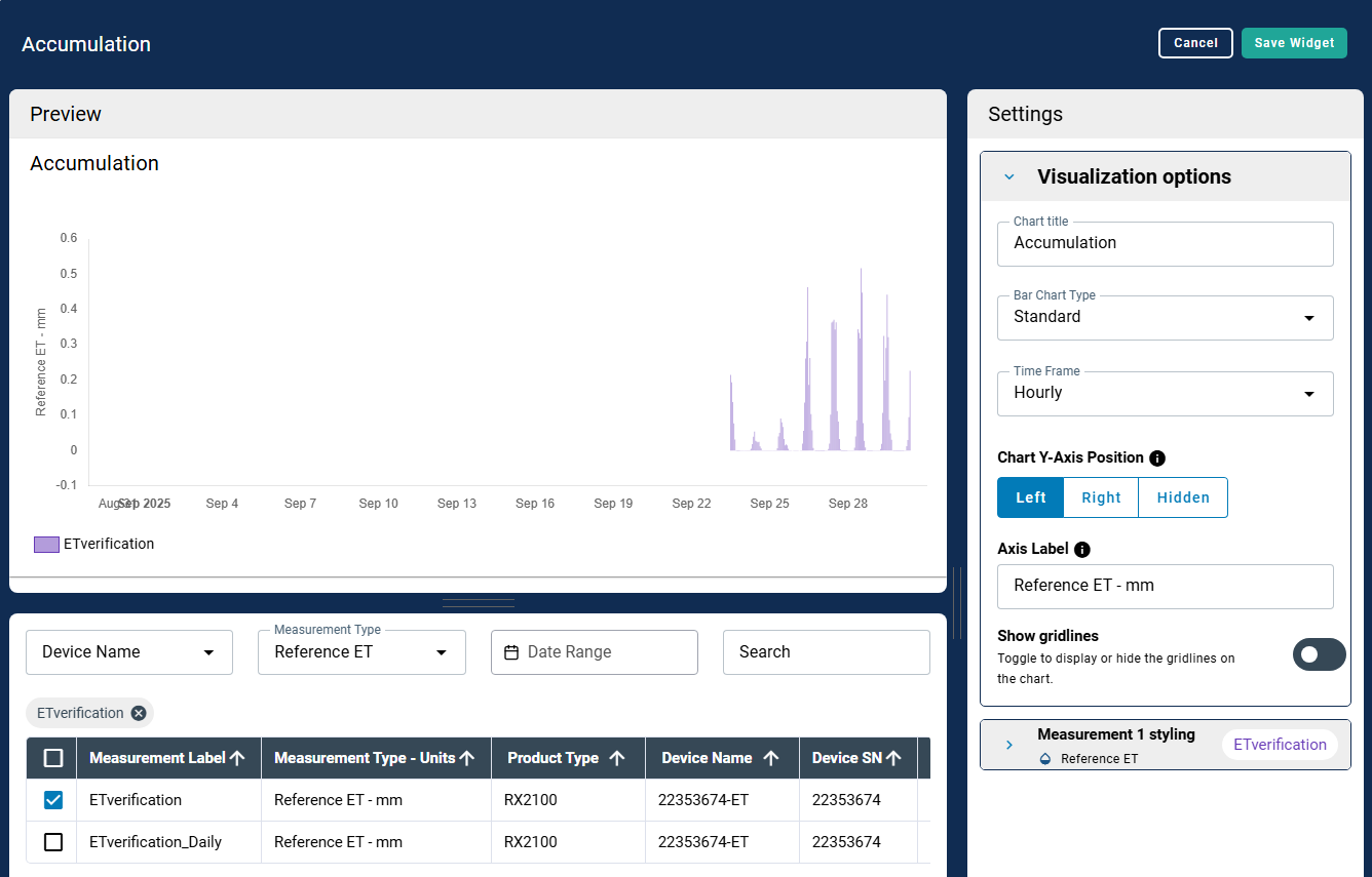Accumulation is the sum of a measurement over a time period. Variables that are typically displayed in an accumulation widget may include rainfall, evapotranspiration, or carbon flux.