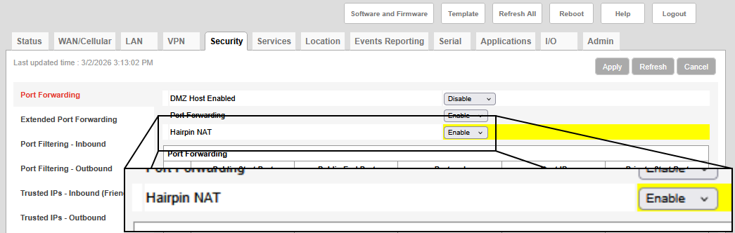 Cellular modems with ALEOS v4.16.0 or newer include the Hairpin NAT option. When the Hairpin NAT is enabled, it allows you to check the validity of the network setup (port forwarding, for example) while connected to the local network of the gateway but using the public IP address. For example, if you are setting up the LI-COR system and you want to confirm that the LI-COR system can be reached via the public IP address of the gateway, you can do so without leaving the site or leaving the gateway network. Simply enter the public IP of the gateway in the LI-COR software. If the settings are correct, it will resolve the connection to the correct device. If Hairpin NAT is disabled, such requests are rejected by the gateway firewall.
