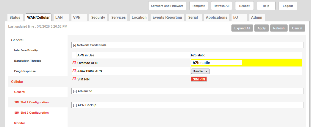 The Override APN feature can be used in cases where the APN provided by the service provider must be changed due to the connection type. For example the T-Mobile default APN setting is fast.t-mobile.com, but with a fixed public IP address you will enter b2b.static instead, as shown in Figure 3‑2.