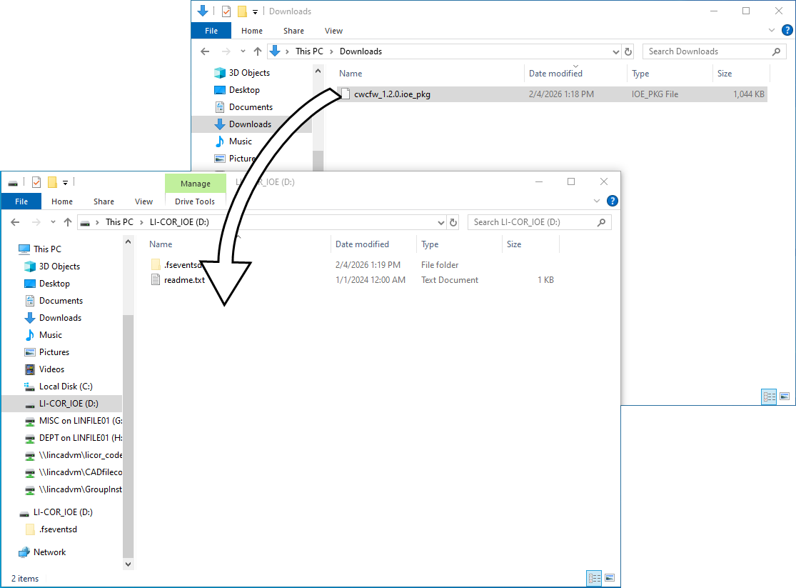 It will start in update mode and appear as a USB drive on your computer called LI-COR_IOE.
