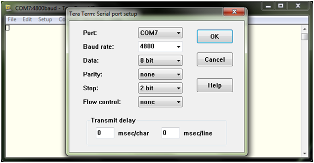 - Select Baud rate = 4800, Data = 8 bit, Parity = none, Stop = 2 bit, and Flow control = none. Click OK.