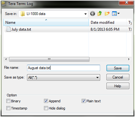 - This is where your log file will be saved. Select the directory you want and the name of the file. Instead of the default file extension (.log), you can append it with a text file extension (.txt). For the options at the bottom, you’ll want to enable ‘Append’ and ‘Plain Text’, but nothing else. Press Save. Tera Term is now ready to receive data.