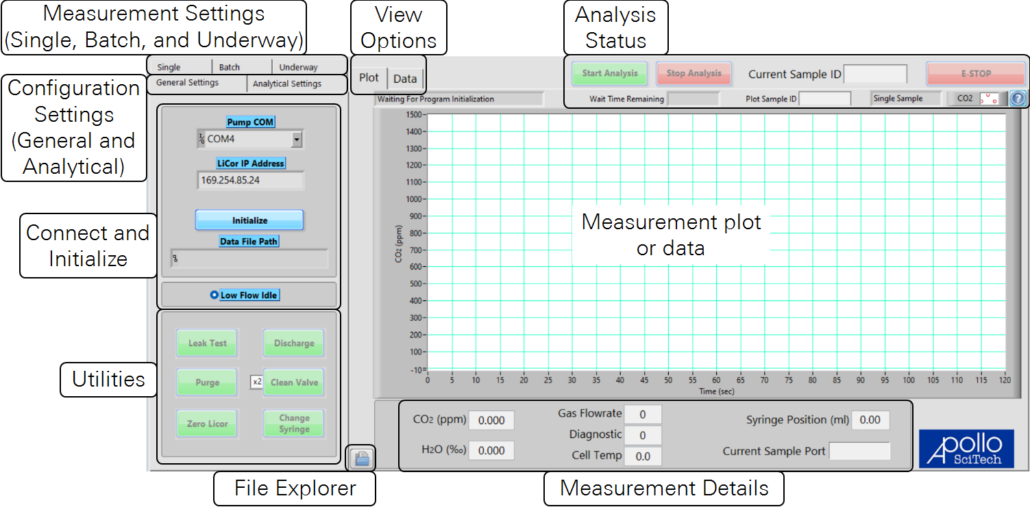 In the upper left, five tabs present settings, including General Settings, Analytical Settings, Single Analysis, Batch Analysis, and Underway Analysis. The View Options allow you to view a plot or table of data. In the upper right, Analysis Status includes controls to start and stop the analysis, as well as some details about the analysis. File Explorer (Historic Data) presents options to view saved data. Measurement Details present current measurement information.