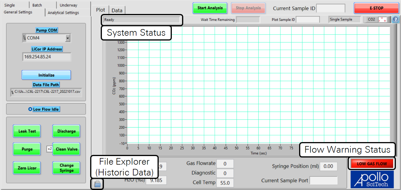 The Analysis Status viewer indicates the status of the current analysis. It will show Ready and the Waiting Time Remaining will be blank when the system is not waiting for a timer. In the meantime, CO2 (ppm), H2O (‰), carrier gas flow rate (mL/min), LI-7815 diagnostic, and cell temperature (°C) are displayed underneath the plot area.