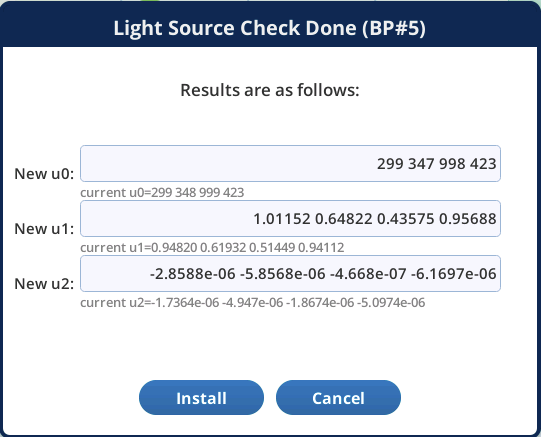 When it is done, another dialog is presented showing the results. Tapping Install will update the coefficients with those that were just calculated.