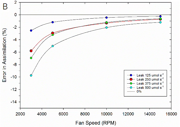 In summary, the susceptibility of the LI-6800 to chamber leaks will be negligible in most operating conditions. Best measurement practice includes operating at fast fan speeds and preventing significant chamber leaks which can introduce bias into your measurements. Software release 1.1 includes information regarding current leak status as well as the correction factor being applied to assist with avoiding problem areas.