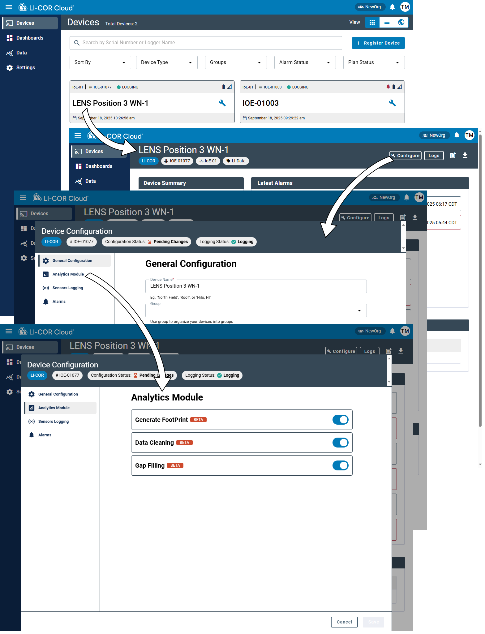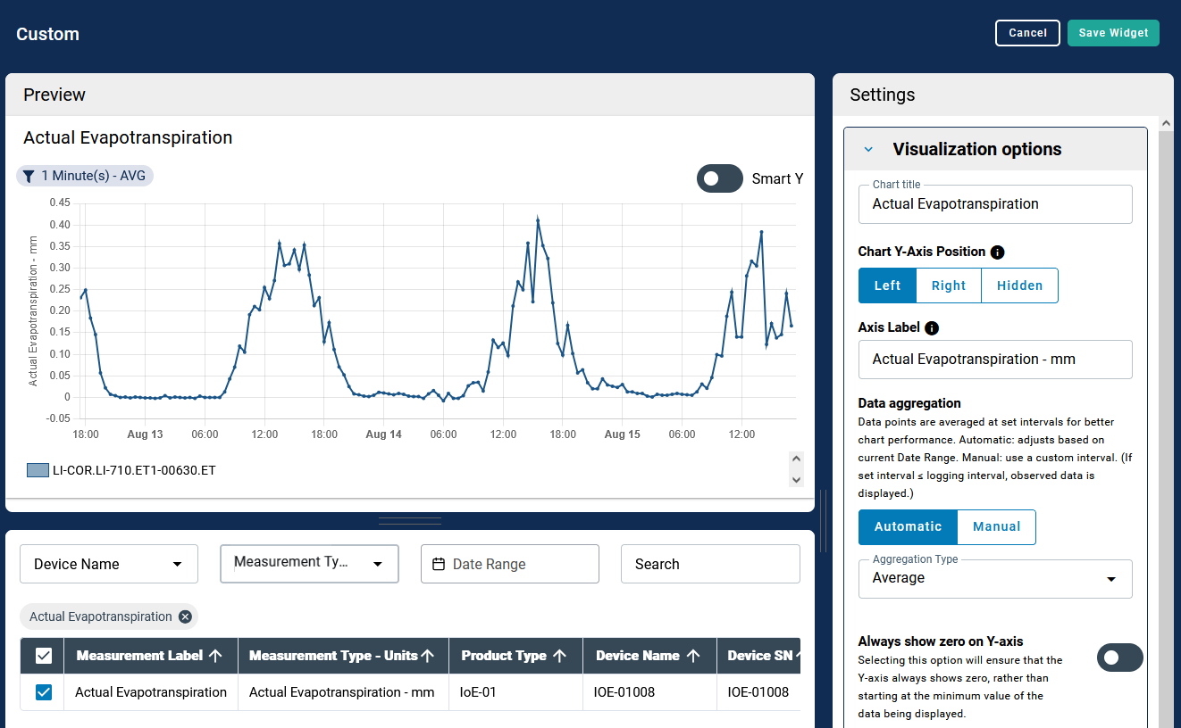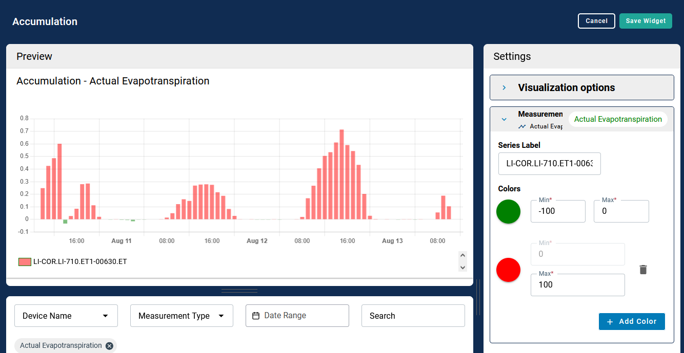 To view data from an instrument, you will create a Dashboard and add Widgets to it. LI-COR Cloud will show a variety of widgets by default. You can add, move, and re-size widgets to suit your preferences. For Water Nodes, two widgets may be of special interest: Accumulation and Gap filling.