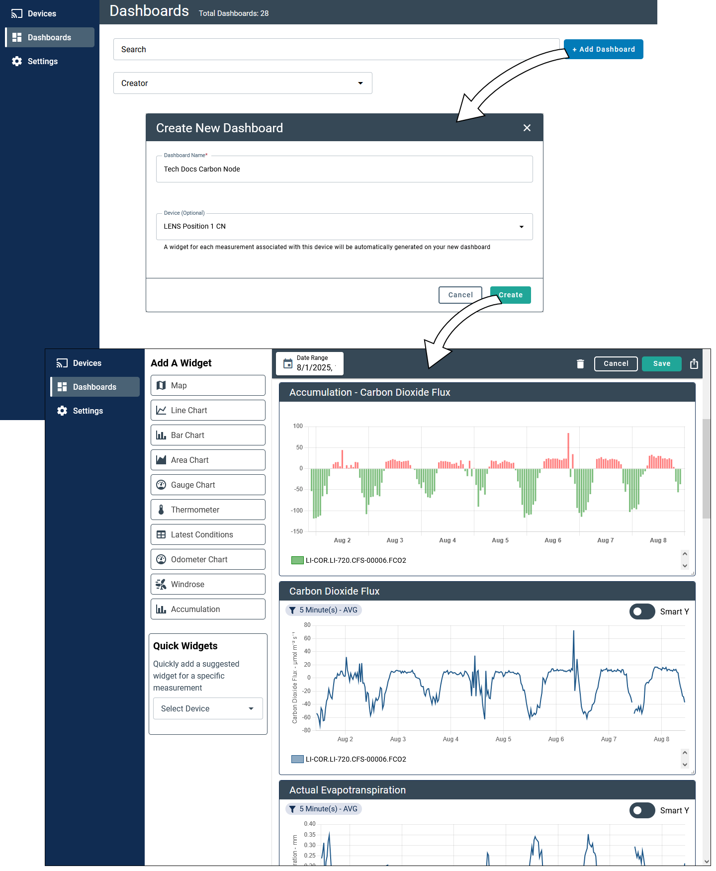 To view data from an instrument, you will create a Dashboard and add Widgets to it. LI-COR Cloud will show a variety of widgets by default. You can add, move, and re-size widgets to suit your preferences. For Carbon Nodes, two widgets may be of special interest: accumulation and gap filling.