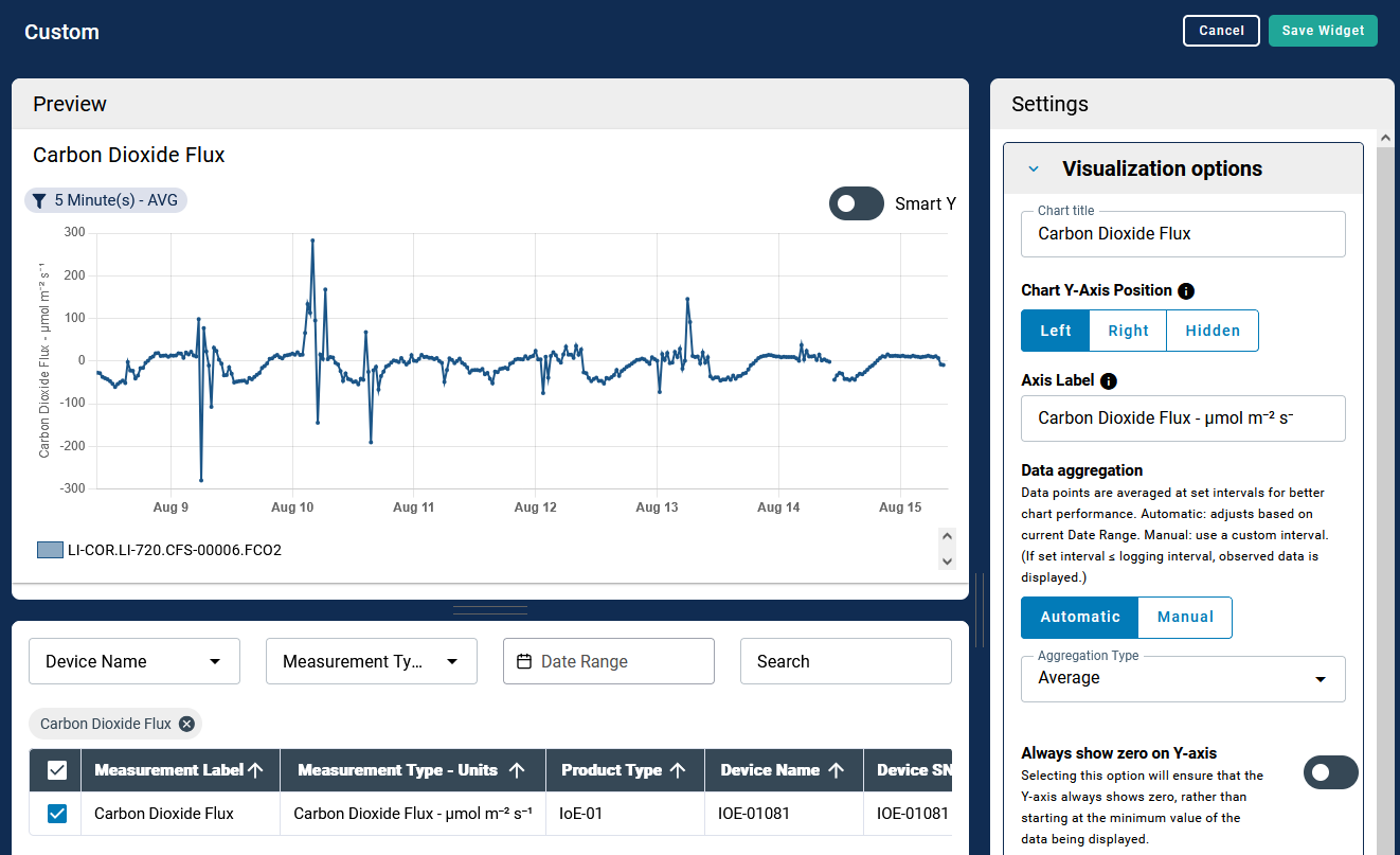 Results from a Carbon Node are uploaded to LI-COR Cloud on the schedule (every thirty minutes by default). Widgets are used to display data from the Carbon Node. Widgets may be used to with default settings or customized to show parameters from multiple sensors and different parameters from the same station.
