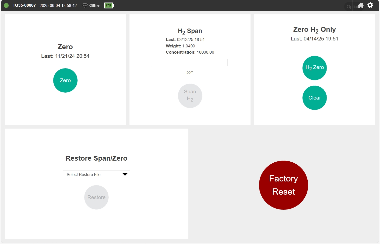 - Under Options > Calibration > H2 Span, enter the concentration of the gas and click Span H2.