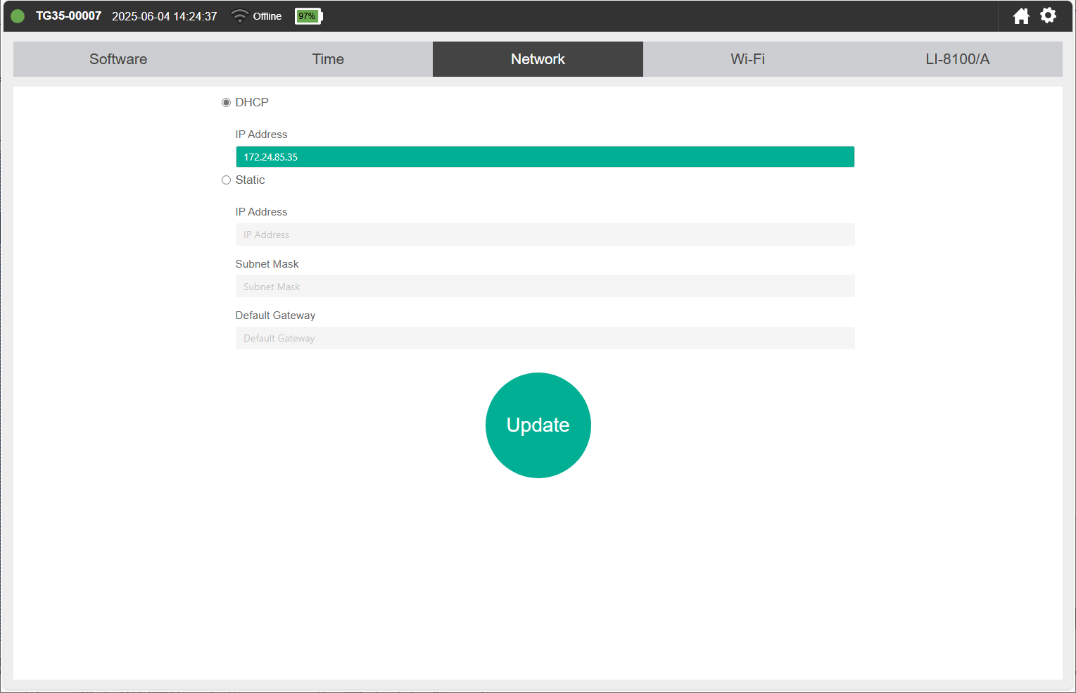 Under Settings > Network, you configure the network settings. If you change the settings, click Update to apply them.