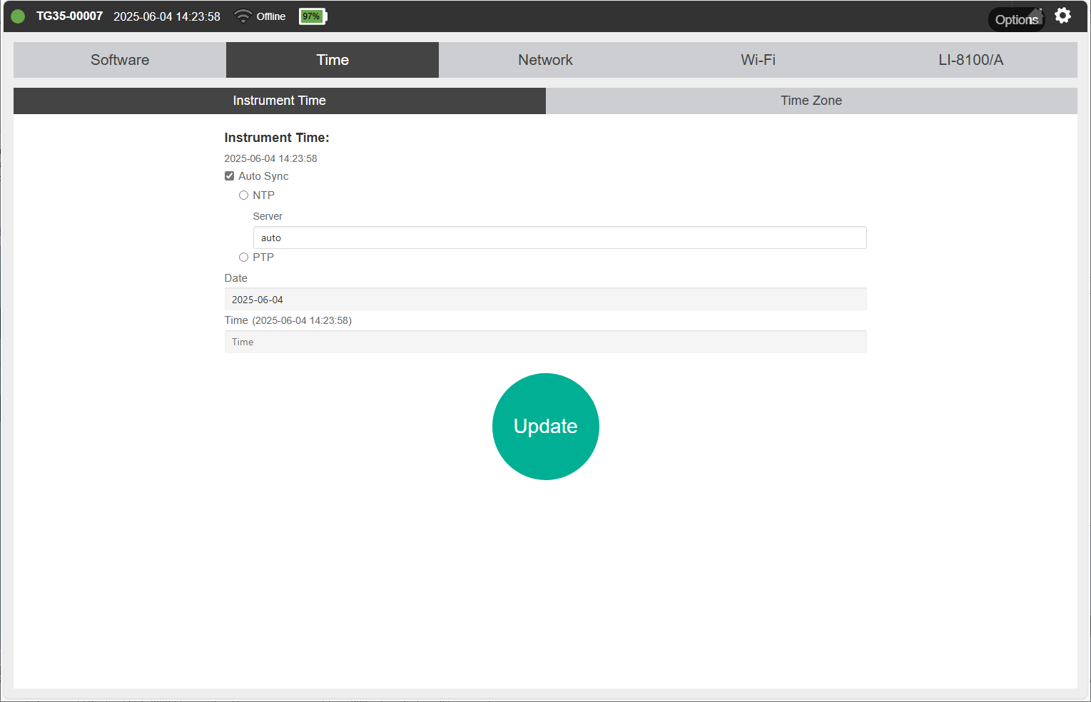 Auto Sync: We recommend using this setting at all times to prevent clock drift. When selected, the instrument will set its clock according to the local network time. When not selected, you must enter the desired time manually. The Auto Sync options are: