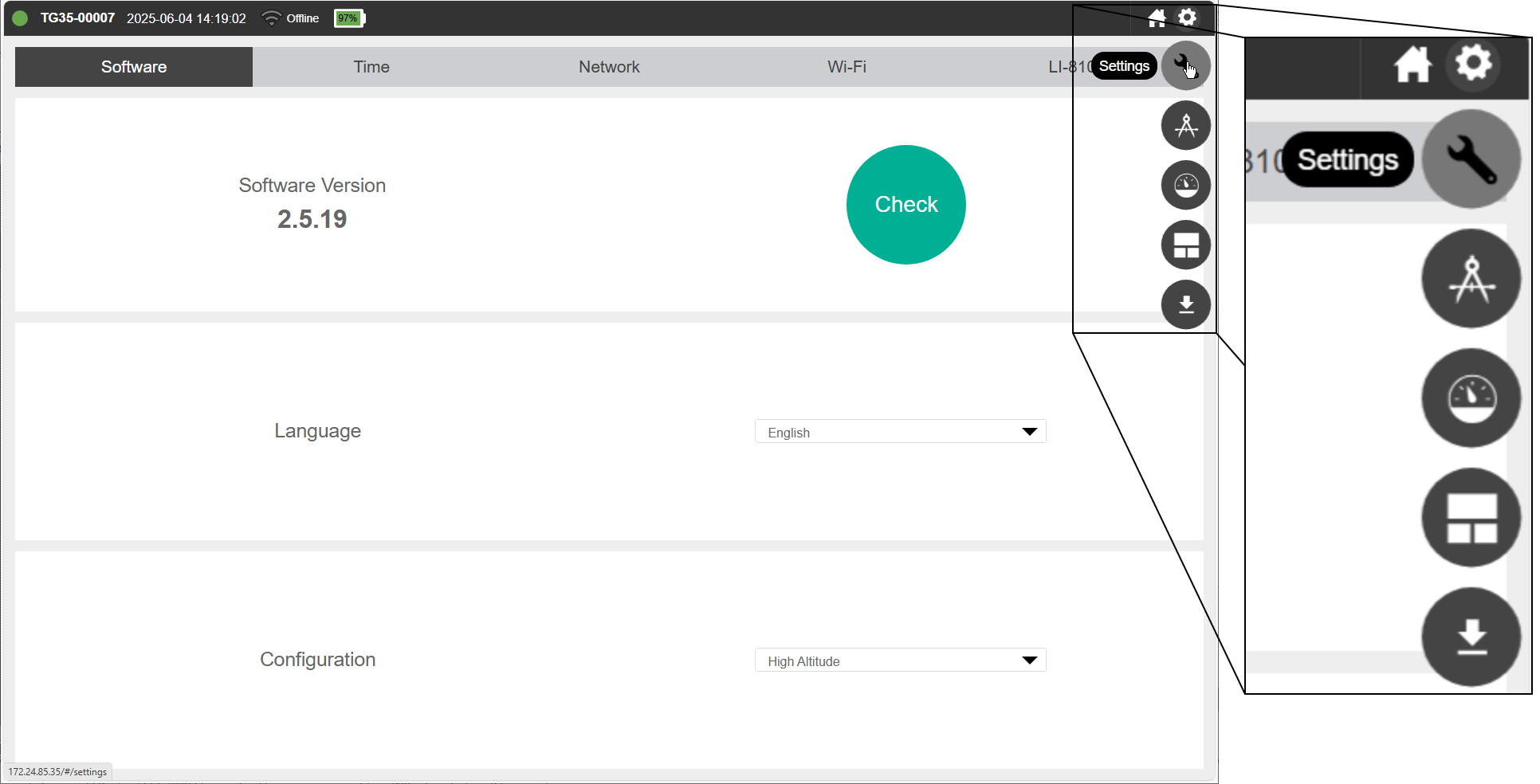 Under Settings > Software, you can check the software version, check for updates, and change the language setting. Click Check to check for software updates. The instrument must be online to check. See Software updates for update instructions.