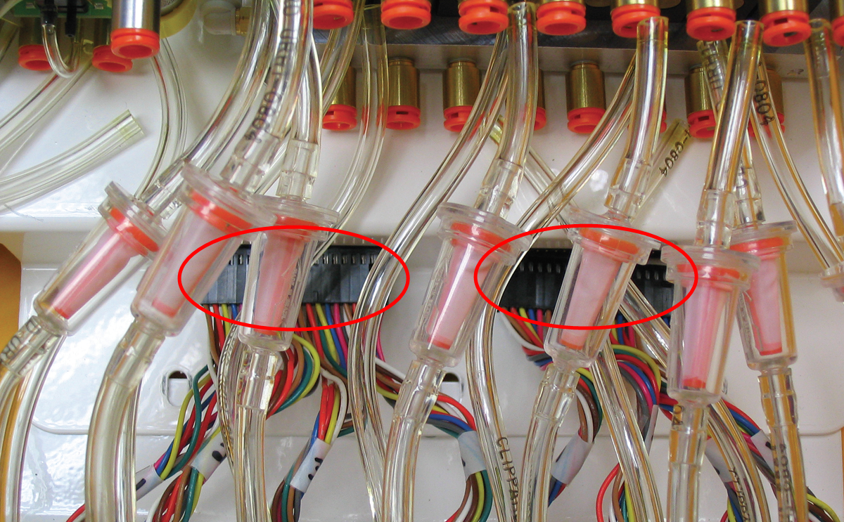 - The upper solenoid assembly block is connected to the control panel assembly with the included filter assemblies (p/n 9981-123). Note the orientation of the filters; there is an arrow embossed on the filter, which must point toward the solenoids. The filter assemblies are cut to a standard length; some may need to be trimmed slightly so that they each have a slight “S” curve. Attach all eight filter assemblies, making sure the tubing isn’t crimped.