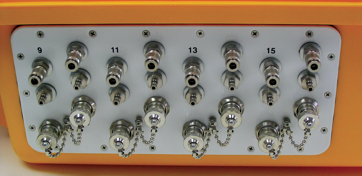 - Disconnect the existing tubing from the right control panel assembly at the compression fittings. There are connections at 19 locations; 8 each on the upper and lower solenoid valve assemblies, and 3 on the Air In (I), Air Out (O), and Pressure (P) fittings, respectively. Push in on the orange collar of the compression fittings and pull straight out on the tubing to remove.