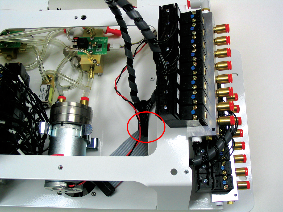 - Locate the solenoid valve cable assembly (p/n 9981-113). This cable assembly has a single connector on one end; the other end is divided into the solenoid valve assemblies for the upper and lower solenoid banks. Note that one of the sets of valve assemblies is attached via a short cable, and the other set via a slightly longer cable.