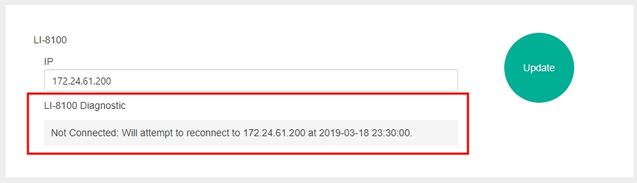 Now you can connect the LI-8100A and LI-7810 to the network switch using the communications cable (part number 392-09436). Click Update to the save the settings. In setups with a cellular modem, the gateway should be the IP Address of the modem.