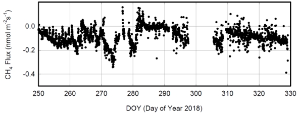 Because of microbial oxidation, the soil is normally a CH4 sink with a typical rate of -0.2 nmol m-2s-1 with a maximum rate of around -0.35 nmol m-2s-1. This is expected and consistent with published rates in the literature (e.g. Ueyama, at al. 2015). An example of CH4 time series data for one observation is shown below.