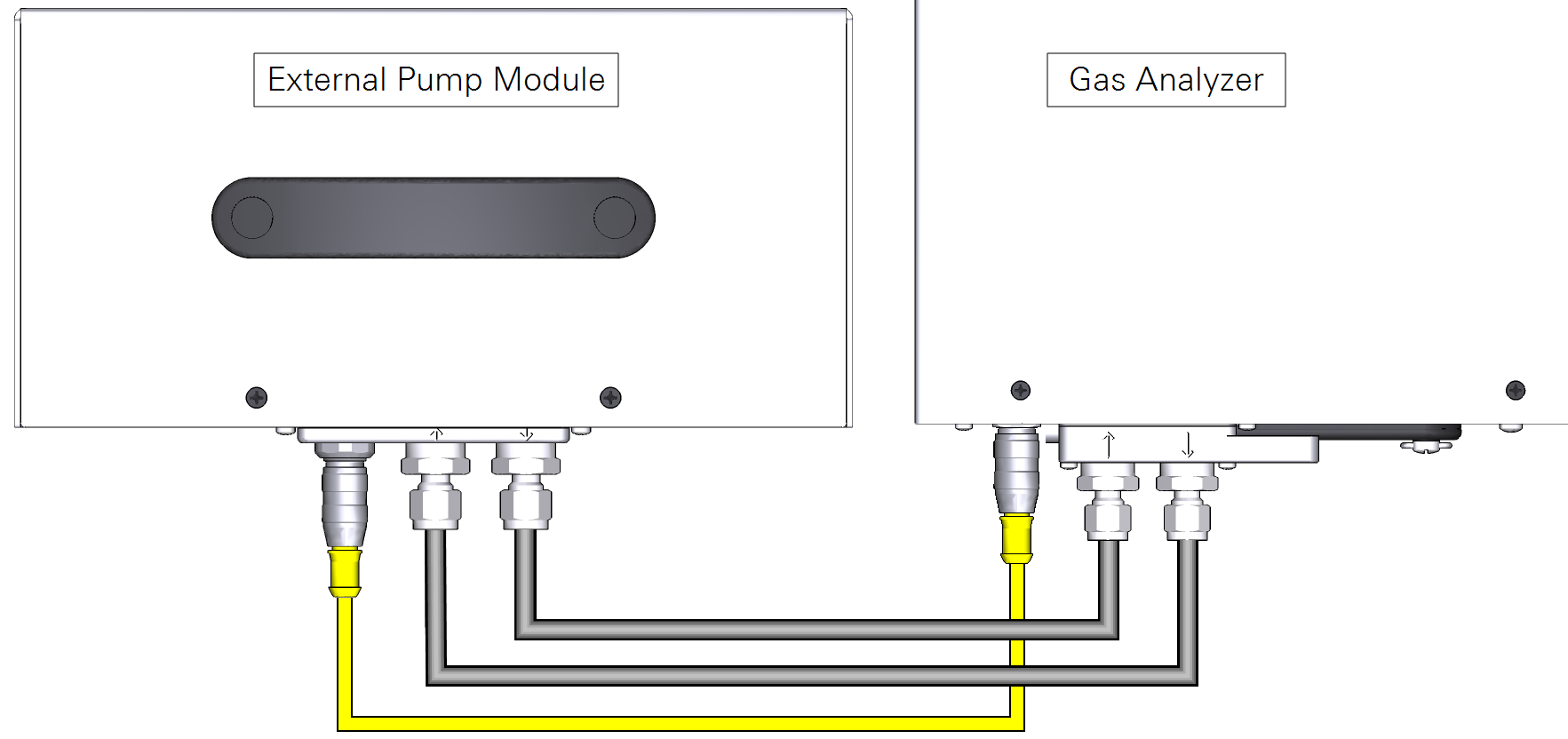 An external pump can be used instead of the built-in pump. The external pump is powered by the gas analyzer. It has air inlet and outlet ports and a power cable connector. To connect the external pump, power off the analyzer and follow these steps: