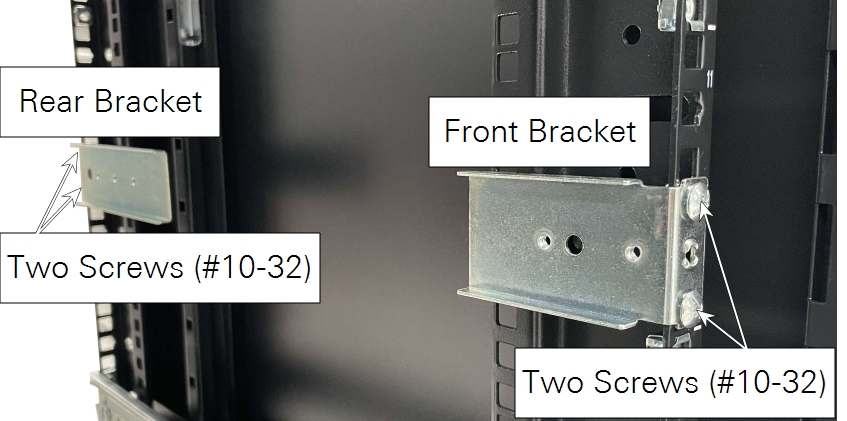 Figure 2‑1. Rails attach to the rack with brackets and screws at the front (left) and back (right). Instrument racks vary; install the rails using the best method for your rack. -