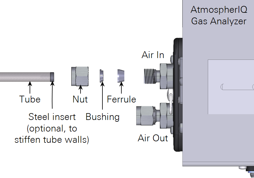 Air is drawn into the sample cell through the air inlet. Connect tubing to the inlet with the nut, bushing, and ferrule from the accessories kit. Optional stainless steel inserts (300-18126) are included for use with soft tubing. Tubing can be connected to the inlet and the outlet in the same way.