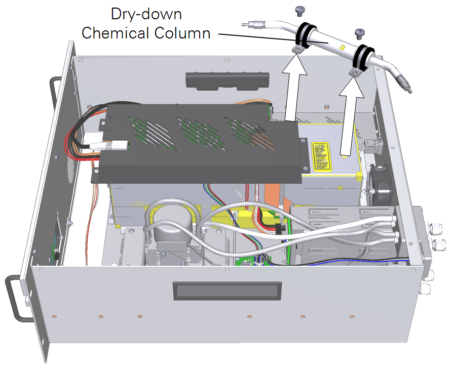 - It is secured with two screws. Remove them. When the column mounting brackets are removed, the column can come apart easily, and the silica gel beads can fall out. Be careful when handling the column so that it does not come apart.