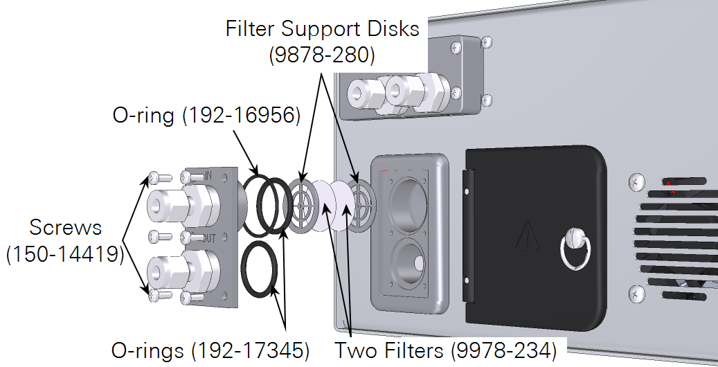 - Install two filters (part number 9978-234) between the support disks. The two metal discs support the filter(s) — one on each side. Align the centers of the filters and the metal disks. Assembly is the reverse of disassembly. You do not need to use thread locking compound on the threads. Tighten them snugly.