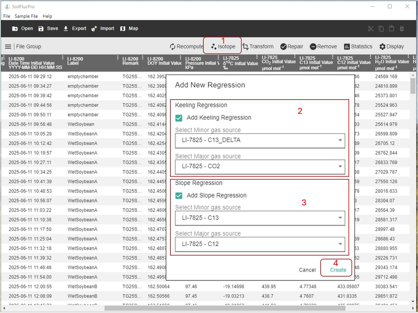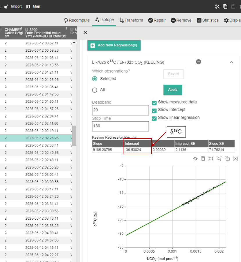Once you import the data file from LI-7825 into SFP software, follow these steps to do the Keeling plot regression and the slope method to determine δ13C of soil respiration (Figure 5).