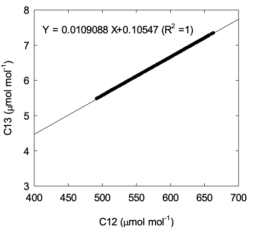 During this test, the Smart Chamber was closed with wet soybean biomass material inside. C13 and C12 were continuously measured with the LI-7825 for two minutes. From this measurement, the linear slope for C13 vs. C12 plot was 0.0109088 with R2 of 1.0 (see Figure 2). With the (C13/C12)std of 0.0112372, the δ13C of the soybean biomass material was found to be -29.22 ‰. The dataset shown in Figure 2 is from the same measurement as shown in the Keeling plot analysis in Figure 1A. The δ13C value of the soybean biomass material from the Keeling plot and the slope method are almost identical.