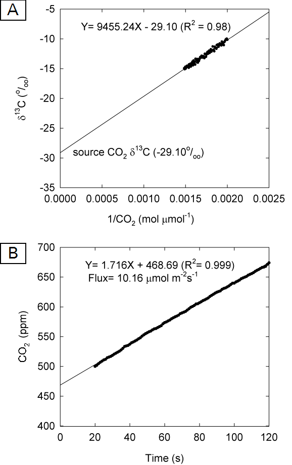 The Keeling plot has been used to determine the carbon isotope ratio (δ13C) of ecosystem respiration (Pataki et al., 2003), soil respiration (Flanagan et al., 1999), and other CO2 sources. With the closed-chamber method for soil CO2 flux measurements, the δ13C of soil CO2 from soil organic matter decomposition can be determined with the Keeling plot method (Flanagan et al., 1999) if the δ13C of chamber air is known as well. To do this, the chamber air δ13C is plotted against the inverse of chamber CO2 concentration and the intercept from that linear regression gives the carbon isotope ratio of the soil CO2 respiration (Pataki et el., 2003). Figure 1A shows an example of Keeling plot analysis from a closed chamber measurement with the Smart Chamber and an LI-7825. The Smart Chamber was sitting on a collar with a sealed aluminum base filled with moist soybean biomass material. From the 2-minute measurement, the Keeling plot yields an intercept of -29.10 ‰ for carbon isotope ratio for the source CO2 (i.e. soybean biomass material). This value is consistent with the value for a typical C3 species. The 2-minute time series of chamber CO2 concentration is shown in Figure 1B. The first 20 seconds of data points were excluded in the Keeling plot and linear regression analysis.